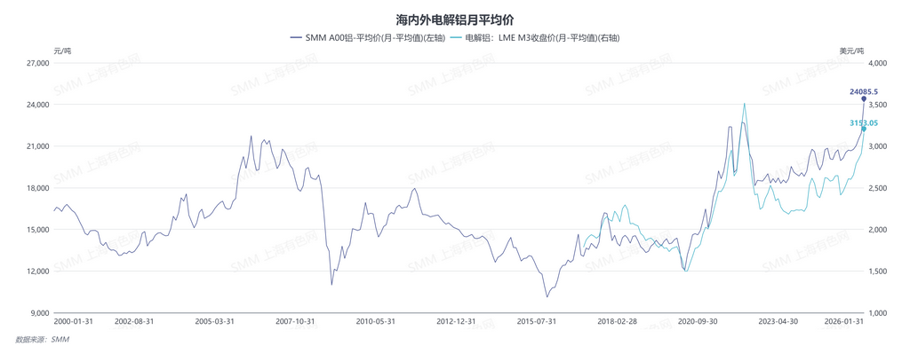 2024年12月开始,资金助推沪铝价格创历史新高,2026年1月30日,沪铝主力合约最高价触及26185元/吨,2026年1月SMM A00铝均价录得24085元/吨,创历史新高。