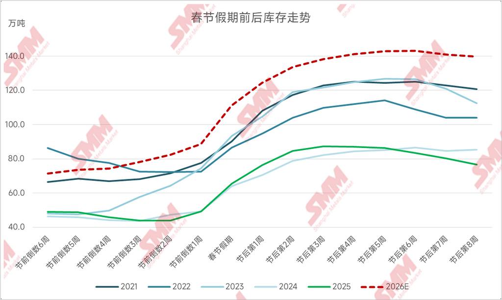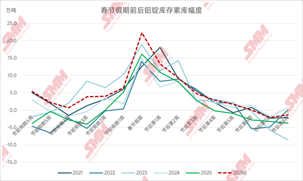 结合历史累库趋势、铸锭量预期及当前价格测算,SMM预计,若铝价维持当前高位水平,且铝锭均能顺利发送至社会仓库,2026年春节后,全国铝锭社会库存高点预计将达到130-150万吨左右,创近五年新高,节后铝价预计将面临较大库存压力。