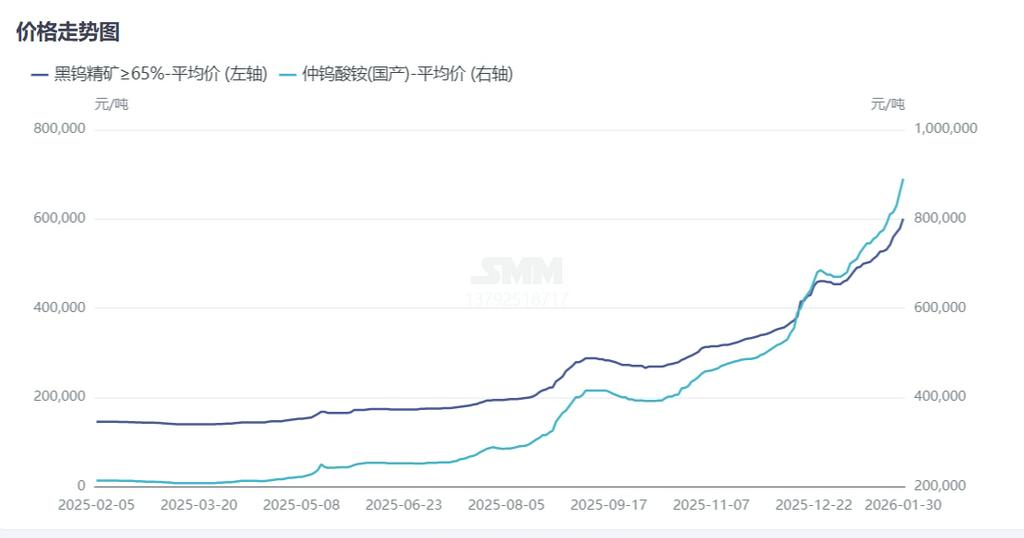 2026年1月,全球钨市场强势运行,钨矿及上游APT市场价格涨屡创新高,1月国内江西等钨矿主产区打击盗采及灰产等原因,部分小矿山开工下降,而下游APT等冶炼环节月内补库需求增加,钨原料市场供需矛盾加剧刺激市场跳涨加剧。截止1月30日,SMM65%黑钨精矿收报60.0-60.1万元/标吨,月内累计上涨14.7万元/标吨,涨幅达32.4%。SMM仲钨酸铵收报89万元/吨,月内累计上涨22万元/吨,涨幅达32.8%。粉末及硬质产品均呈现不同程度上涨,涨幅多跟随原料市场波动为主。废钨市场资金热度不减,月内废钨钻头、废钨棒材累计涨幅达35%-38%左右。