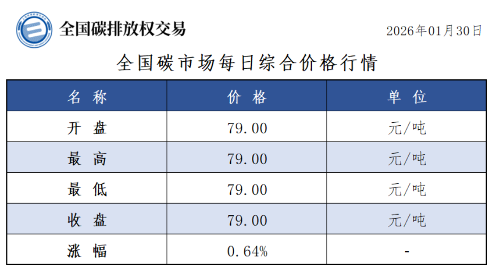 2026年1月1日至1月30日,全国碳市场碳排放配额成交量10,935,009吨,成交额794,730,241.80元。