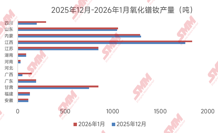 SMM1月31日讯:本月,氧化镨钕市场供应呈现小幅回升态势,但其产量增长幅度较为有限。这主要得益于部分在去年12月因设备检修、环保核查或市场需求调整等因素而停产的稀土分离厂,于本月内陆续启动复产程序。然而,由于大多数分离企业的复产计划安排在本月中下旬,实际有效生产时间较短,导致从原矿端产出的新增氧化镨钕数量并不多,未能对市场供应形成显著补充。