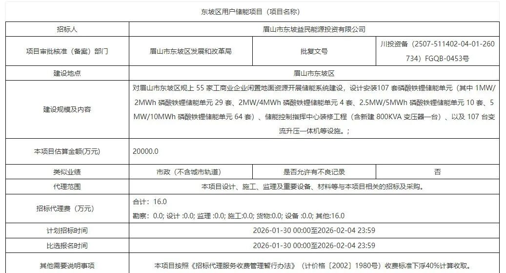 东坡区用户储能项目,项目总规模382MW/764MWh,估算总投资20000万元。项目计划对眉山市东坡区规上55家工商业企业闲置地面资源开展储能系统建设,设计安装107套磷酸铁锂储能单元(其中1MW/2MWh磷酸铁锂储能单元29套、2MW/4MWh磷酸铁锂储能单元 4 套、2.5MW/5MWh磷酸铁锂储能单元10 套、5MW/10MWh磷酸铁锂储能单元64 套)、储能控制指挥中心装修工程(含新建800KVA变压器一台)、以及107台变流升压一体机等设施。