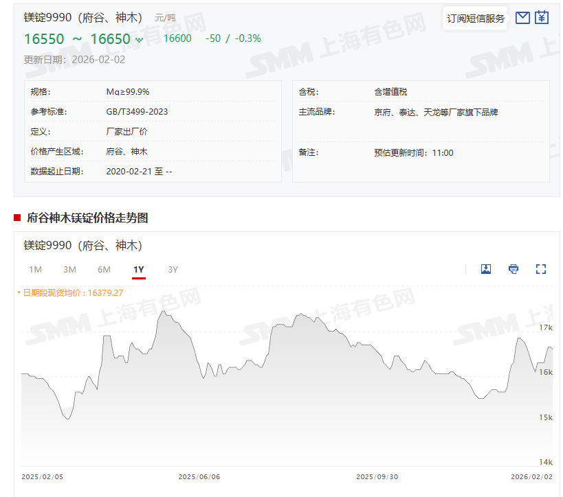 据SMM报价显示:2月2日,镁锭9990(府谷、神木)的报价为16550~16650元/吨,其均价为16600元/吨,较前一交易日跌0.3%。