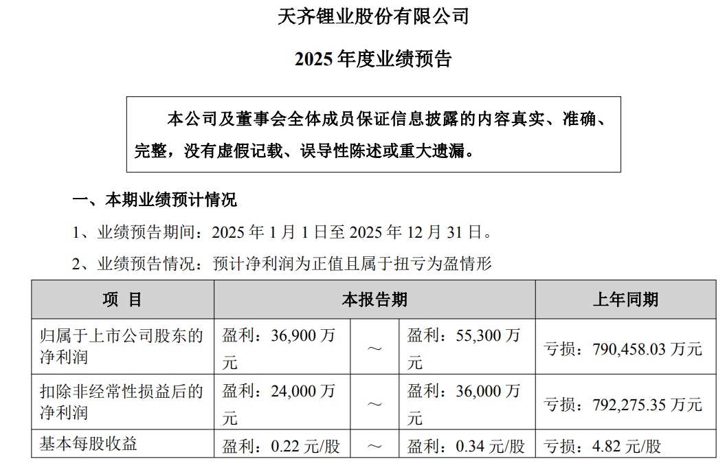 而近期,天齐锂业也发布了其2025年业绩预告,预计公司2025年实现归属于上市公司股东的净利润在3.69~5.53亿元,2024年同期亏损79亿元,2025年同比扭亏。