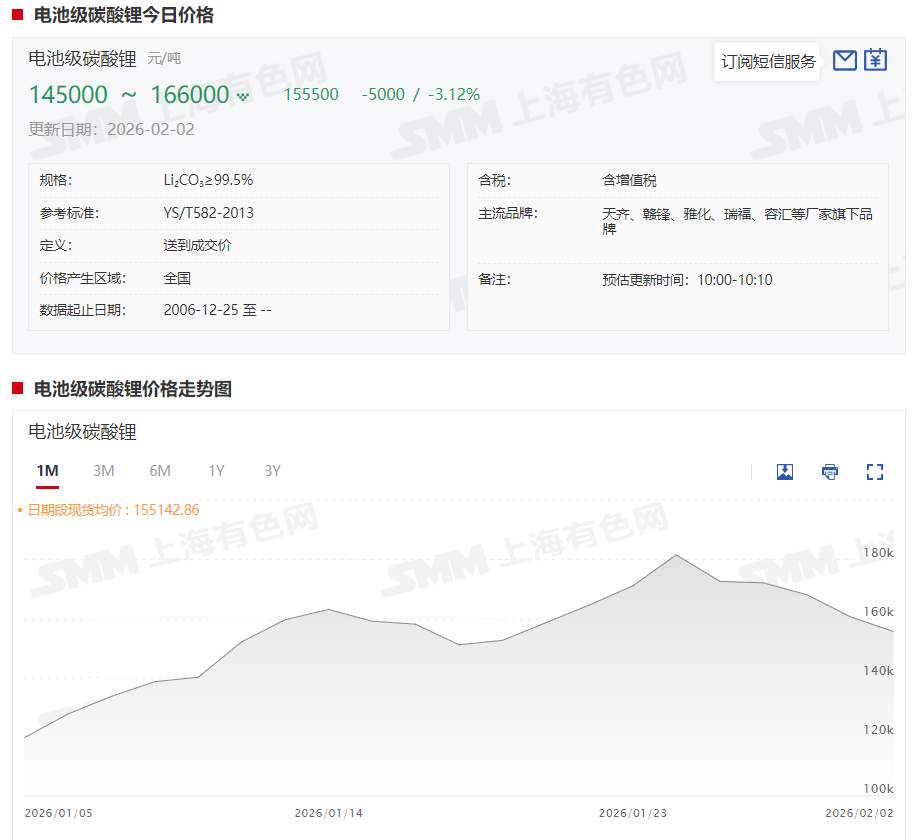 截至2月2日,电池级碳酸锂现货报价在14.5~16.6万元/吨,均价报15.55万元/吨。