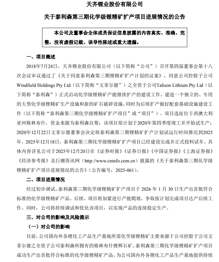 该项目最早可以追溯至2018年7月,2018年7月24日,天齐锂业召开第四届董事会第十八次会议审议通过了《关于同意泰利森第三期锂精矿扩产计划的议案》,同意公司控股子公司Windfield Holdings Pty Ltd之全资子公司Talison Lithium Pty Ltd(泰利森)正式启动化学级锂精矿产能继续扩产的建设工作,建造一个独立的、专用的大型化学级锂精矿生产设施和新的矿石破碎设施,同时为后续扩产做好配套基础设施建设工作(简称“泰利森第三期化学级锂精矿扩产项目”或“项目”)。