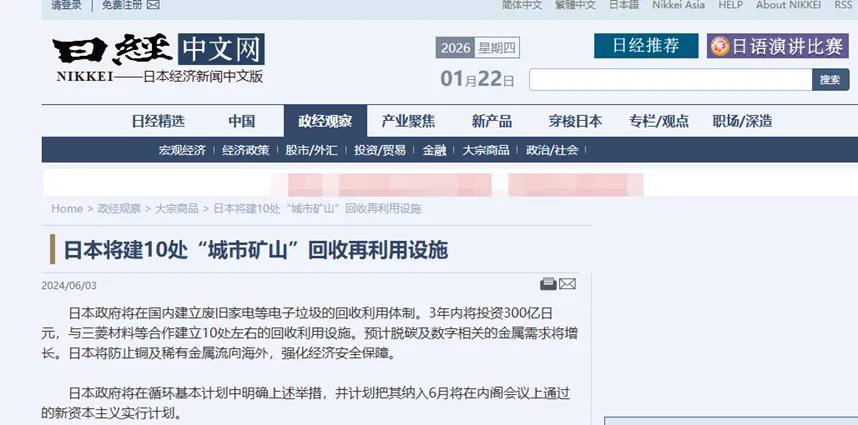 此外,2024年《日本经济新闻》曾有报道,日本政府计划在国内建立废旧家电等电子垃圾的回收利用体制。3年内将投资300亿日元(约合1.9亿美元),与三菱综合材料公司等合作建立约10处回收利用设施。预计与脱碳及数字领域相关的金属需求将增长,日本将防止铜及稀有金属流向海外,强化经济安全保障。