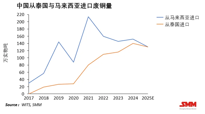 图片为2017-2025中国从泰国与马来西亚进口废铜量走势图,在一定程度上反映出自2021年开始监管全面趋严、通关周期延长,东南亚作为低品质废铜中转中心的时代正走向尾声。