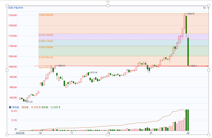 黄金及相关有色板块早盘虽有小幅反弹,但午后均快速走弱、扩大跌幅。关联板块未能实现企稳,进一步加剧了市场的恐慌情绪。目前黄金主力Au2604合约正好跌至前期关键支撑区间1000整数关口附近,如果继续选择向下跌破,则技术上有进一步转弱风险。