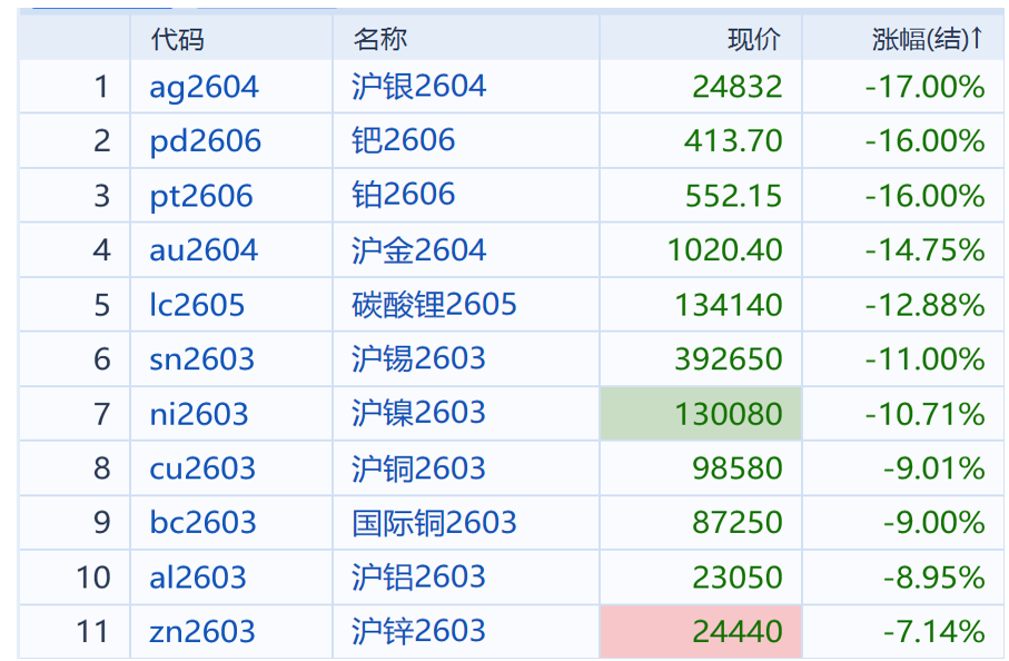今日开盘,国内有色贵金属市场再次经历了显著下跌,午后盘面状况并未出现改善迹象,甚至较今晨进一步恶化,多数合约盘中触及跌停: