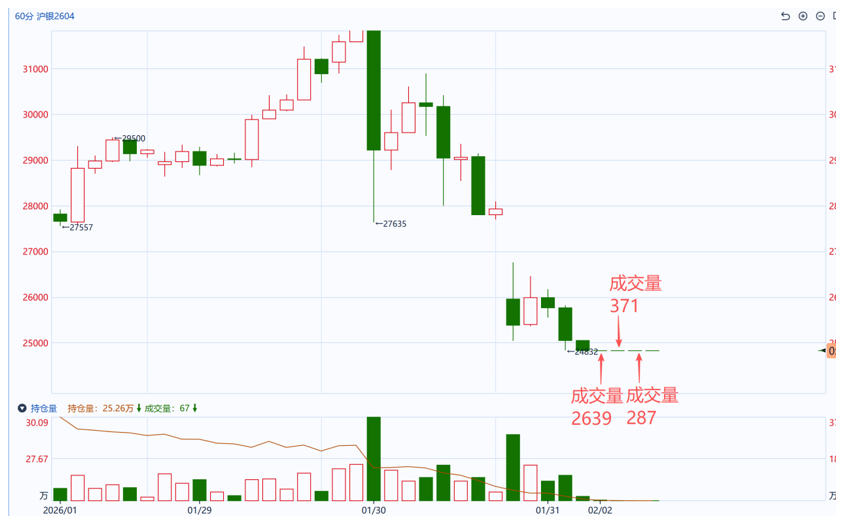 从小时级别走势观察,沪银跌停后成交量持续萎缩:仅在早盘开盘阶段出现千手级别的成交,随后便迅速衰减,至午后小时成交量已缩至仅一两百手,这反映出市场抛压沉重,而投机性买盘几乎消失。