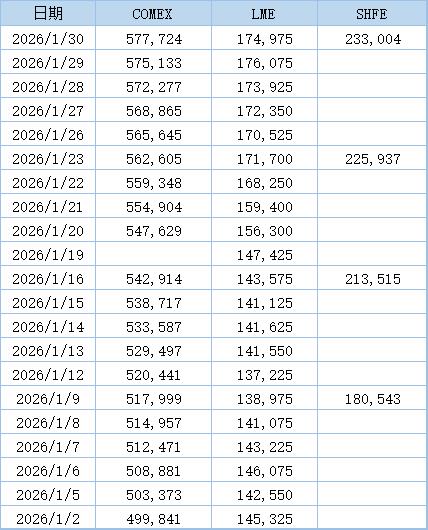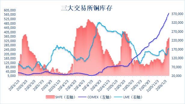 以下为2026年1月以来三大交易所铜库存数据:(单位:吨)