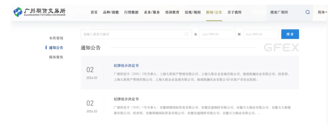 其中一份决定书显示,经查明,安徽硕铜国际贸易有限公司、安徽宏盛铜材有限公司、安徽天大铜业有限公司、安徽天大新能源有限公司4名客户存在实际控制关系,2025年12月1日至12月5日连续5个交易日合并持仓超过PS2512交割月持仓限额,违反《广州期货交易所违规违约处理办法》第二十六条第一项“利用分仓等不正当手段,规避交易所持仓限制”的规定。相关客户违规持仓行为亏损480660元。根据《广州期货交易所违规违约处理办法》第二十六条规定,交易所决定给予这4名客户公开谴责、暂停开仓交易6个月的纪律处分,并将纪律处分结果记入证券期货市场诚信档案。
