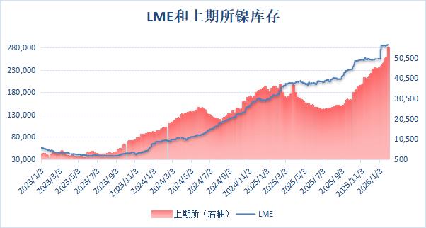 上期所公布的数据显示,1月30日当周,沪镍库存继续累积,目前已连增五周,周度库存增加9.06%至55,396吨,再刷近八年新高。