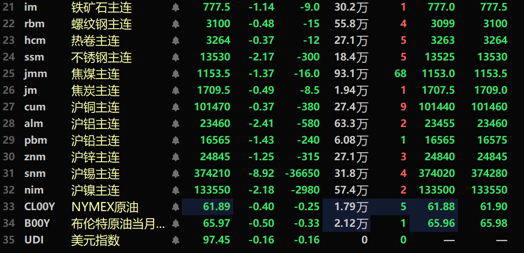 黑色系均飘绿,铁矿跌1.44%,螺纹跌0.48%,热卷跌0.37%,不锈钢跌2.17%。双焦方面:焦煤主力合约跌1.37%,焦炭主力合约跌0.49%。