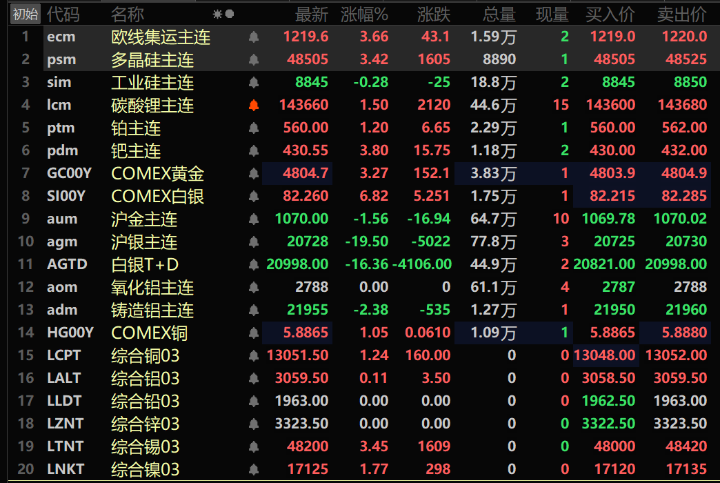 此外,截至午间收盘,铂主连期货涨1.2%,钯主连期货涨3.8%。