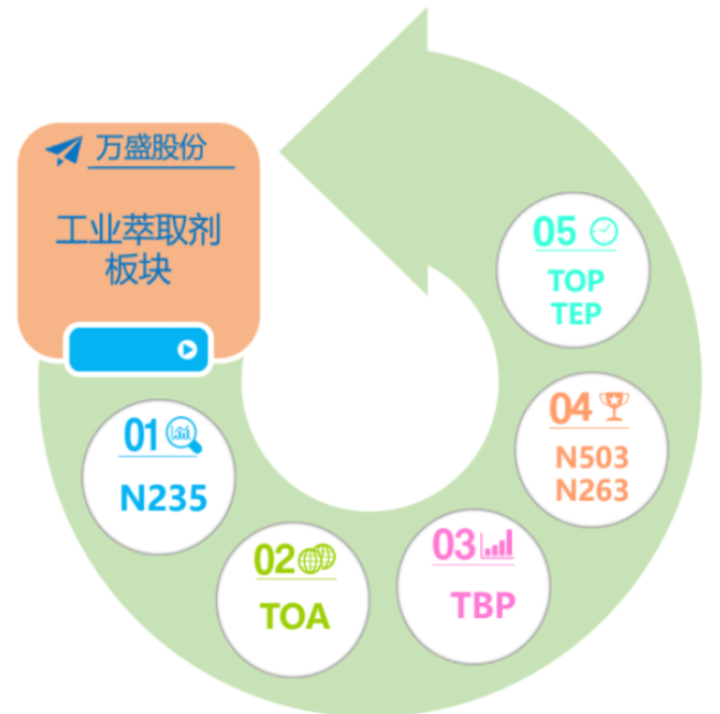 万盛股份萃取剂板块拥有 三辛/癸烷基叔胺(N235)、三正辛胺(TOA)、N503、TBP、N263、TOP、三异辛胺等胺类和磷酸酯类萃取剂产品,合计产能约15000吨/年,可用于净化湿法磷酸、稀土金属萃取、锂电池废水金属回收、废水苯酚提取、相转移催化剂和涂料颜料精制萃取、冶炼金属提取等工业领域应用。其中江苏万盛基地的N235和三正辛胺在市场具有主导地位,以及新型N503高效萃取剂均已广泛用于国内外核心企业中,同时出口美洲、欧洲、澳洲、非洲、东南亚等地区。