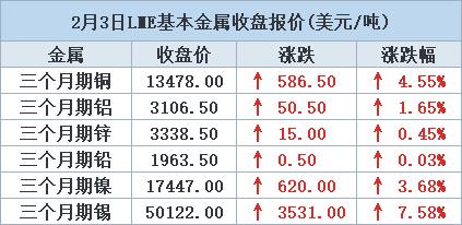 伦敦时间2月3日17:00(北京时间2月4日01:00),三个月期铜收盘上涨586.50美元,或4.55%,报每吨13,478.00美元,此前一个交易日曾跌至三周低位。