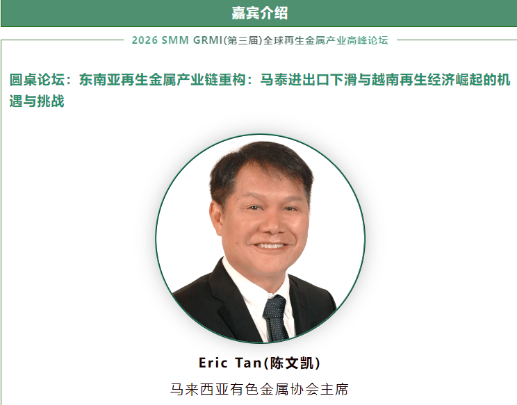 值此背景下,在2026 SMM GRMI(第三届)全球再生金属产业高峰论坛现场,我们有幸邀请到马来西亚有色金属协会 主席 Eric Tan(陈文凯)先生参与圆桌论坛,聚焦东南亚再生金属产业链重构,探讨马泰进出口下滑与越南再生经济崛起带来的机遇与挑战。