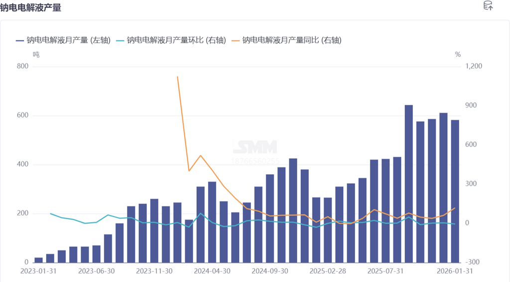 1月钠电电解液产量环比减少5%、同比增长119%,市场延续按需生产的核心逻辑,因电解液产品不宜长期存放,企业节前备库意愿远低于正负极材料。价格端迎来小幅调整,受前期六氟磷酸钠、NaFSi等核心原材料涨价影响,钠电电解液价格同步小幅上行,但价格变动并非影响产量的核心因素,下游钠电电芯步入生产淡季,直接导致电解液需求收缩,成为产量环比下滑的主因。2月行业生产端将进一步承压,因订单偏少叠加春节假期,部分钠电电解液生产线人力或将抽调至锂电生产线,SMM预计2月电解液产量环比减少43%,同比增加26%。
