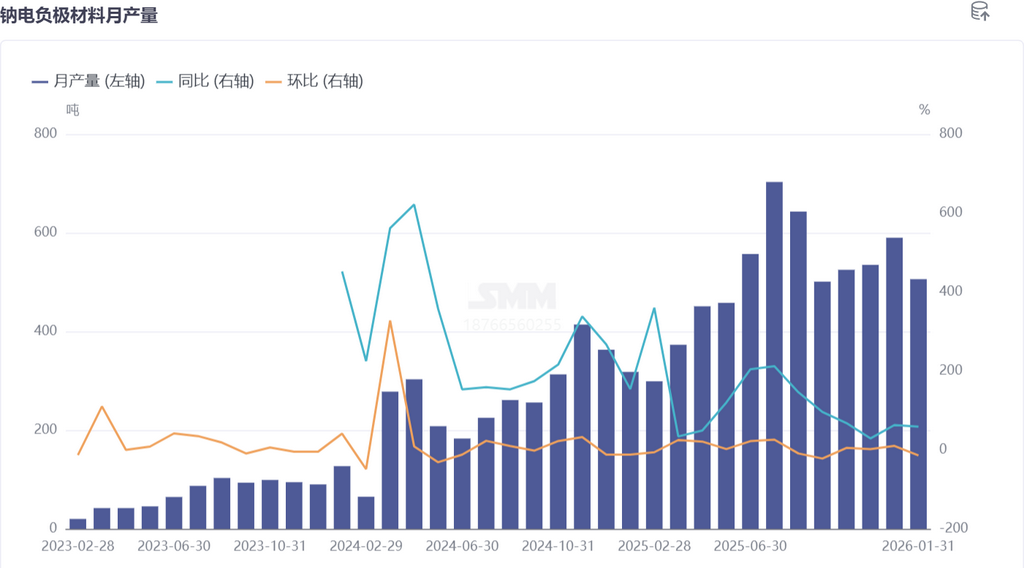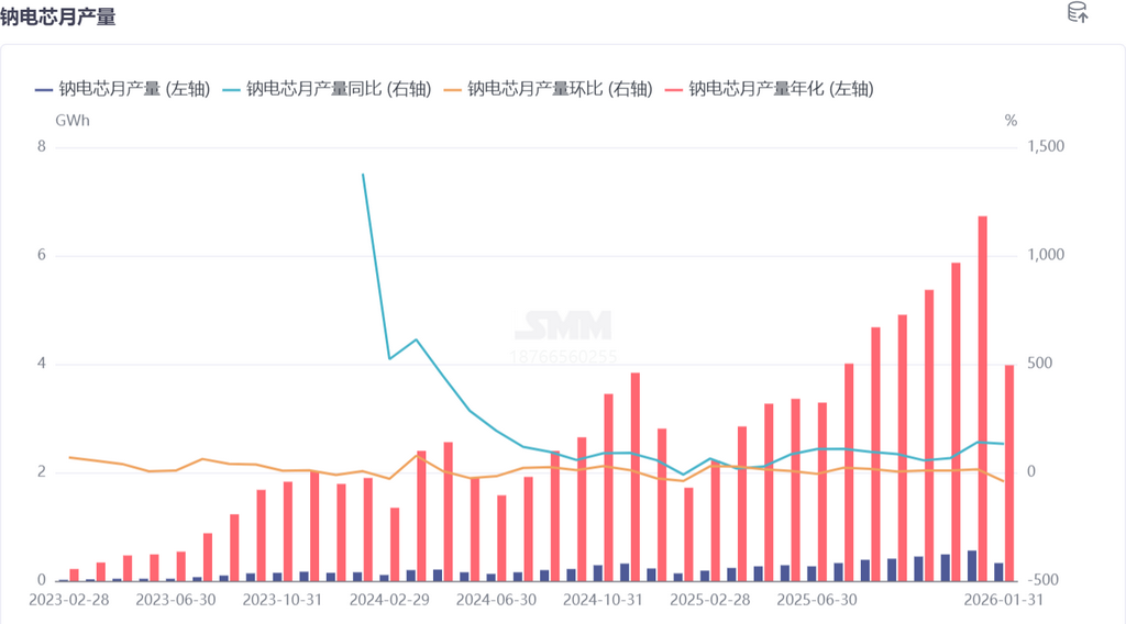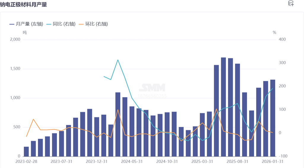 2026年1月,钠离子电池行业步入春节前的特殊运行周期,产业链呈现“节前备库需求支撑+传统生产淡季来临”的双重特征,叠加年初碳酸锂价格上行推升锂电芯成本,钠电产品的市场关注度与替代逻辑进一步强化。从产量表现来看,钠电全产业链各环节产量同比均实现大幅增长,印证行业仍处于商业化落地的快速上升通道,而环比表现则因备库节奏、产品特性及淡季影响呈现显著分化。上海有色网(SMM)对1月钠电正极材料、硬碳负极、电解液及电芯终端全产业链运行情况进行全面梳理,剖析行业当前运行特征并展望短期市场走势。