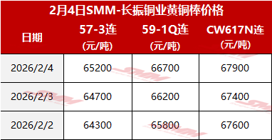 【SMM价格】2026年2月4日长振黄铜棒价格