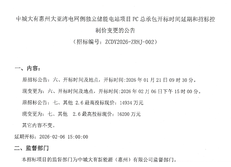 北极星储能网讯:2026年2月3日,中城大有惠州大亚湾电网侧80MW/160MWh独立储能电站PC总承包开标时间延期和招标控制价变更的公告发布,原开标时间2026年01月21日09时30分,变更为2026年02月06日下午15时00分;原最高投标现限价14934万元变更为16200万元,意味着单价由0.9334元/Wh变更为1.0125元/Wh,单价上浮0.08元/Wh。其他招标内容不变。值得注意的是,这已经是该项目第二次发布变更公告。