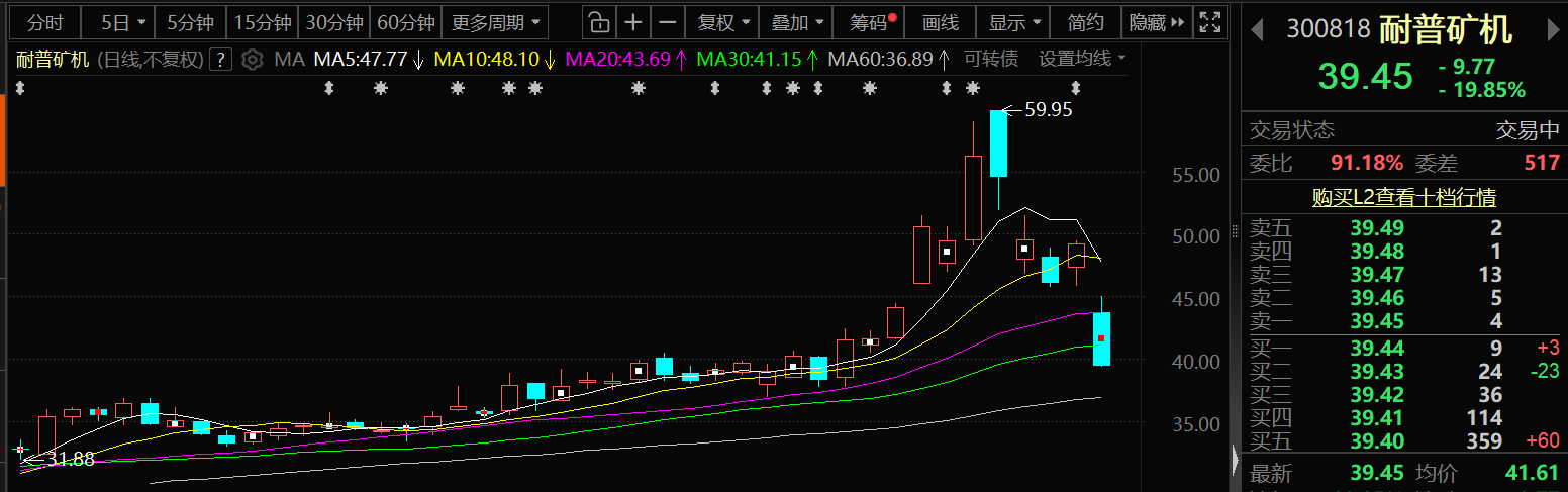 2月4日,耐普矿机股价出现下跌,截至4日14:23分,耐普矿机跌19.85%,报39.45元/股。