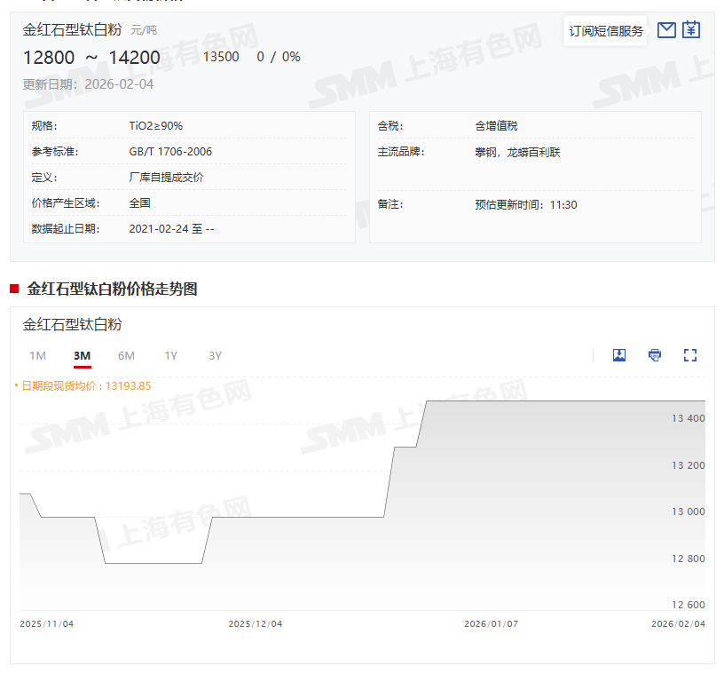 据SMM报价显示,2月4日,SMM金红石型钛白粉报价为12800~14200元/吨,其均价报13500元/吨,与前一交易日持平。