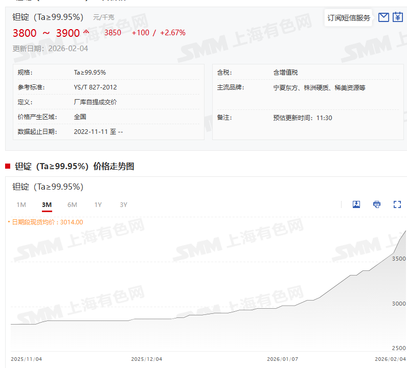 回顾钽锭的历史价格走势可以看到,在钽锭(Ta≥99.95%)的均价于2025年7月23日跌至2800元/千克的前期低点之后,其均价一直维持这一均价至2025年11月10日,随后其均价小幅上涨至2840元/千克之后便持稳至2025年12月初。进入2025年12月以来,钽锭(Ta≥99.95%)价格涨势出现加快,而进入1月以来呈现涨势加快的态势。钽锭(Ta≥99.95%)2月4日的报价为3800~3900元/千克,其均价为3850元/千克,3850元/千克这一均价与2025年11月10日的均价2800元/千克相比,不到3个月的时间里,钽锭(Ta≥99.95%)的均价上涨了1050元/千克,涨幅为37.5%。