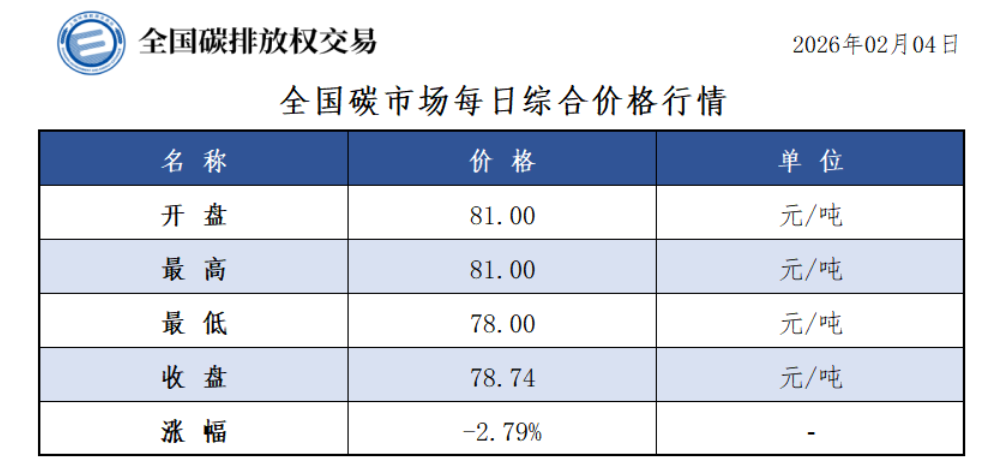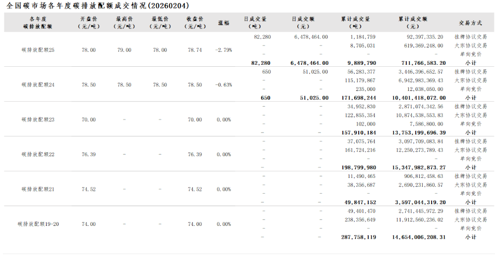 2026年1月1日至2月4日,全国碳市场碳排放配额成交量11,036,949吨,成交额802,799,520.80元。