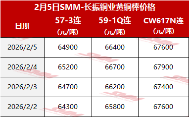 【SMM价格】2026年2月5日长振黄铜棒价格