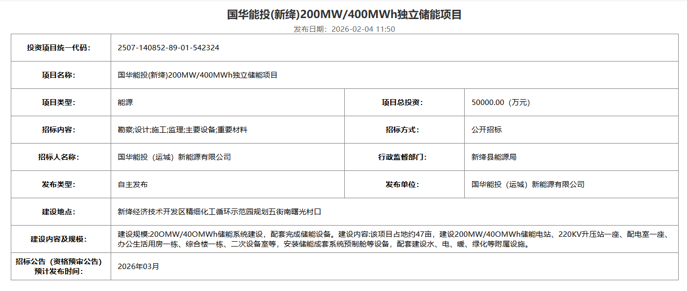 北极星储能网获悉,2月3日,国华能投(运城)新能源有限公司发布200MW/400MWh独立储能项目招标预告,项目总投资50000万元,约合单价1.25元/Wh。招标预计发布时间2026年03月。