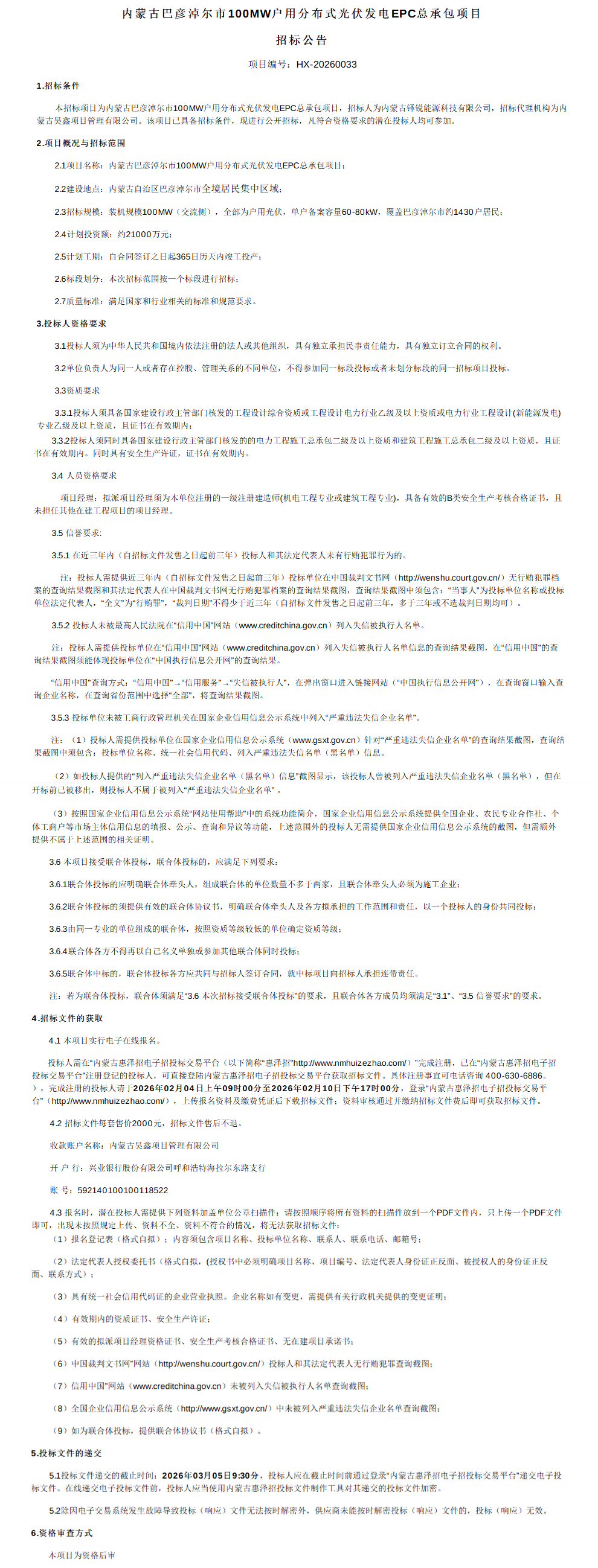 2月3日,【内蒙古巴彦淖尔市100MW户用分布式光伏发电EPC总承包项目】招标公告发布,招标人为内蒙古铎锐能源科技有限公司,建设地点位于内蒙古自治区巴彦淖尔市全境居民集中区域。