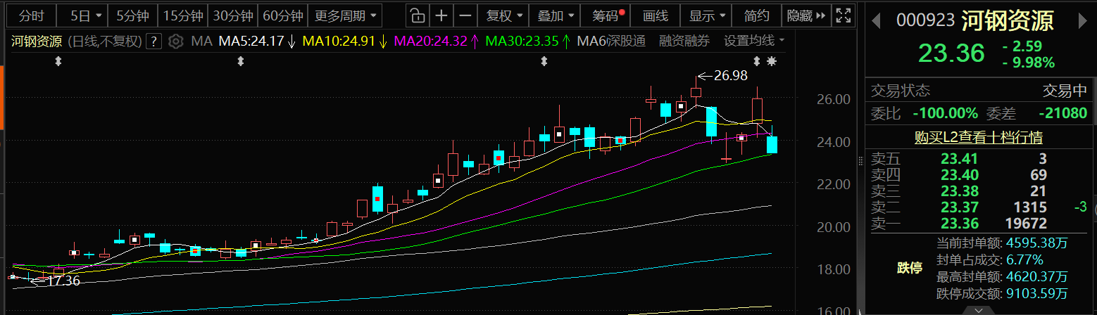 2月5日,河钢资源股价出现跌停,截至5日13:36分,河钢资源跌9.98%,报23.36元/股。