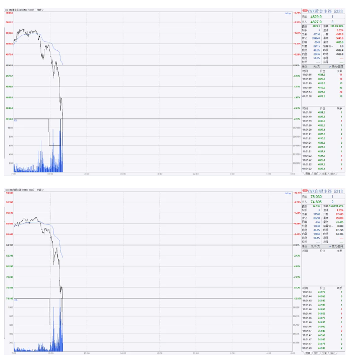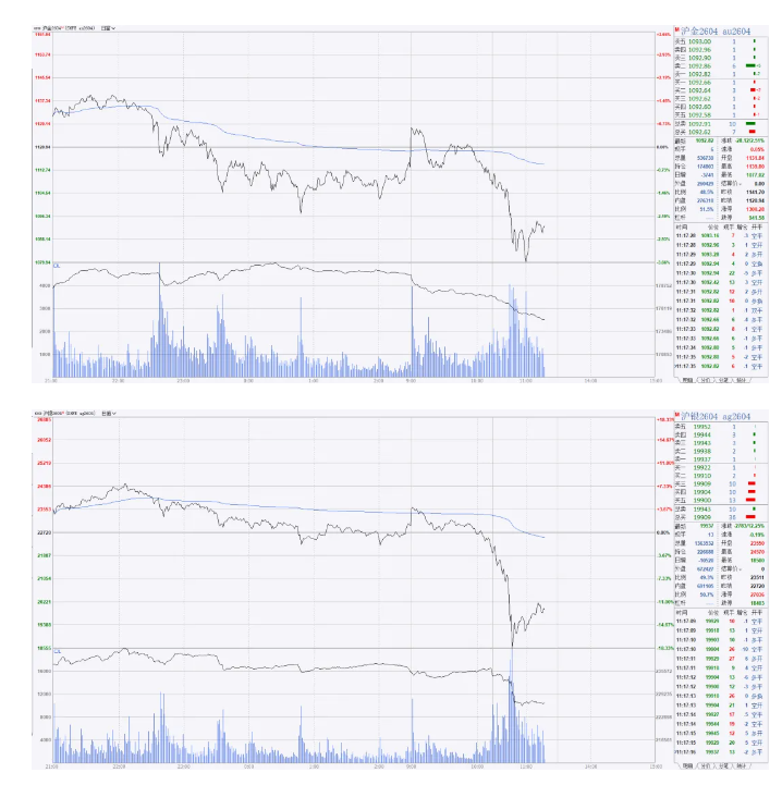 内盘方面,沪金期货主力合约盘中跌超3%,最低跌至1077.02元/克;沪银期货主力合约盘中跌超18%,跌破20000元/千克关口,最低触及18500元/千克。