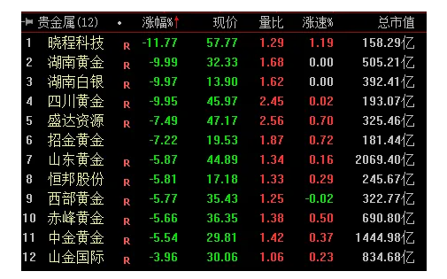 A股贵金属概念股持续跳水。湖南黄金、湖南白银、四川黄金跌停,晓程科技一度跌超14%。