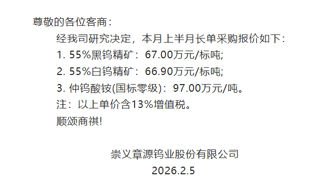 据崇义章源钨业2月5日消息:崇义章源钨业股份有限公司2月上半月的长单采购报价如下:1. 55%黑钨精矿:67万元/标吨,较上轮报价上调14.7万元/标吨;2. 55%白钨精矿:66.9万元/标吨,较上轮报价上调14.7万元/标吨;3. 仲钨酸铵(国标零级):97万元/吨,较上轮报价上调21万元/吨。