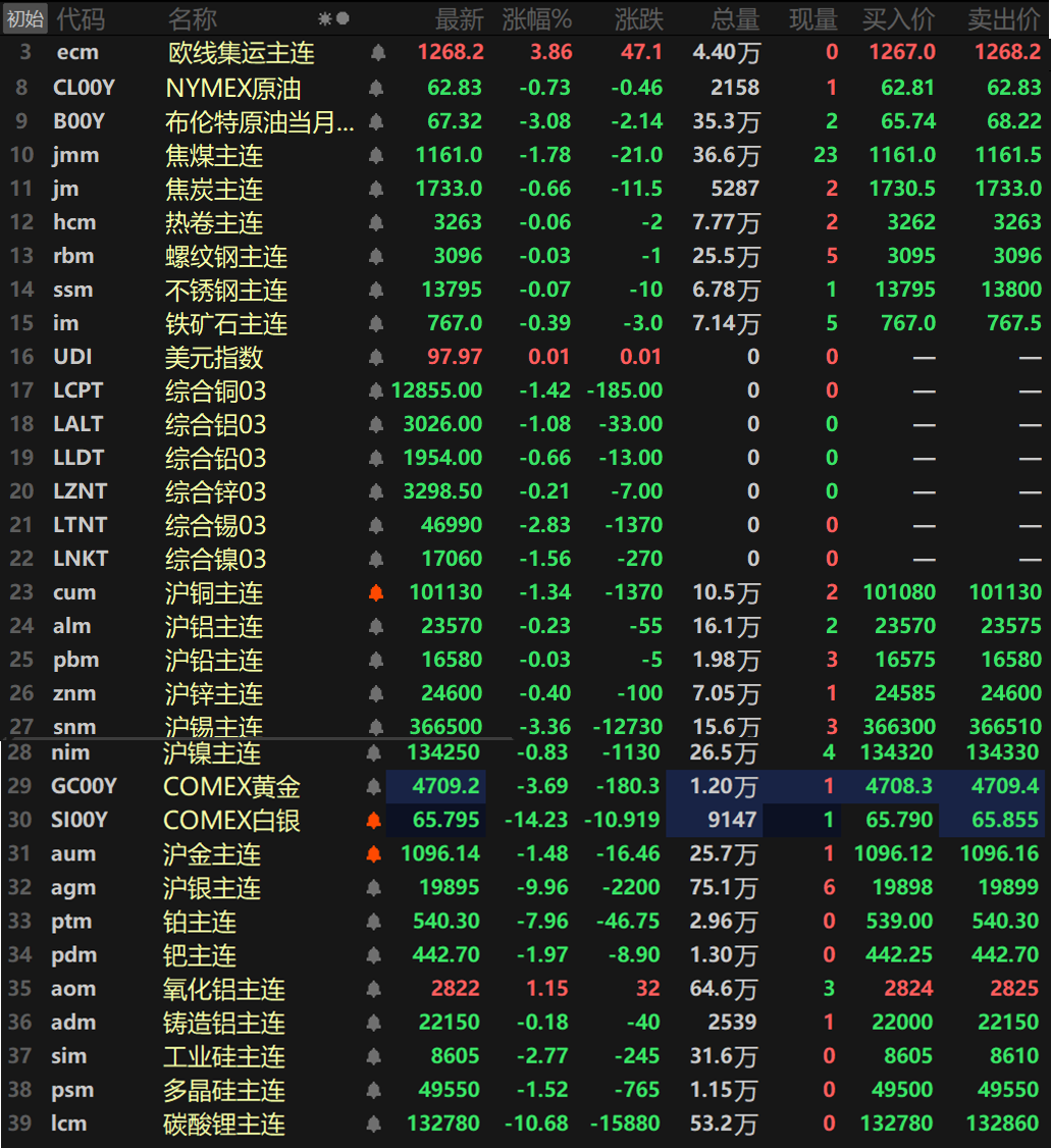 隔夜贵金属方面,隔夜COMEX黄金跌3.08%,COMEX白银跌16.64%。国内方面,沪金跌1.48%,沪银跌9.96%。