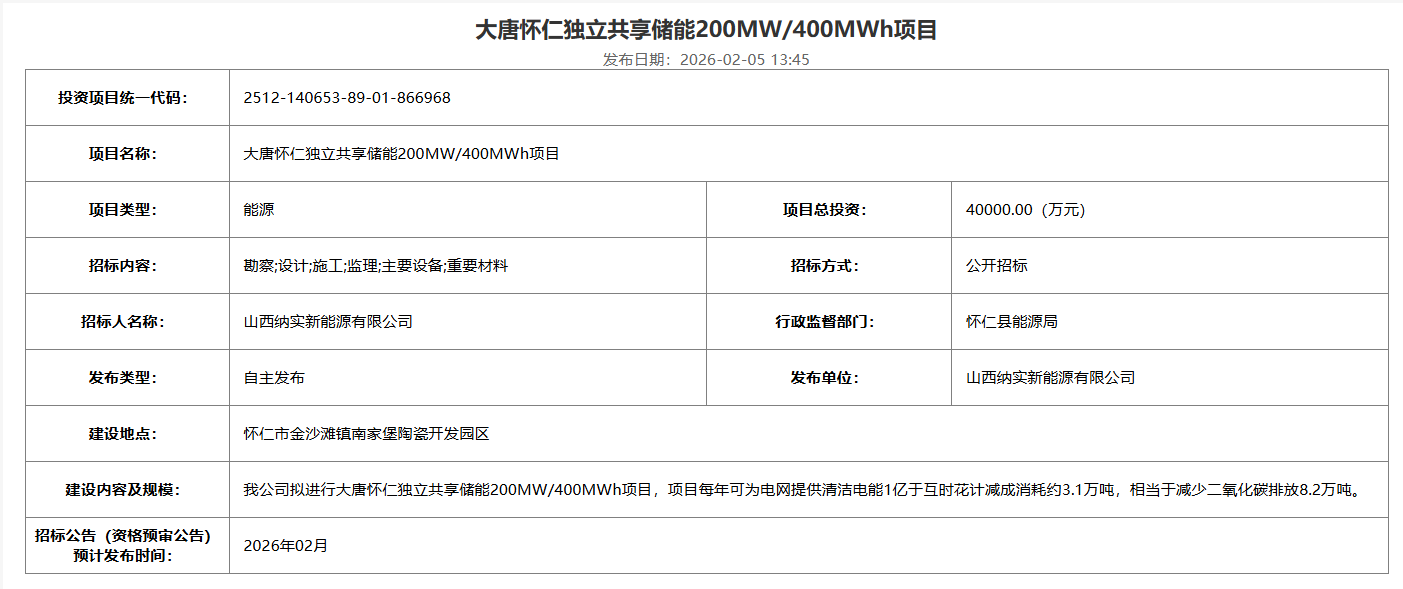 北极星储能网获悉,2月4日,山西纳实新能源有限公司发布大唐怀仁独立共享储能200MW/400MWh项目招标预告,总投资40000万元,合单价1元/Wh,项目每年可为电网提供清洁电能1亿于互时花计减成消耗约3.1万吨,相当于减少二氧化碳排放8.2万吨。