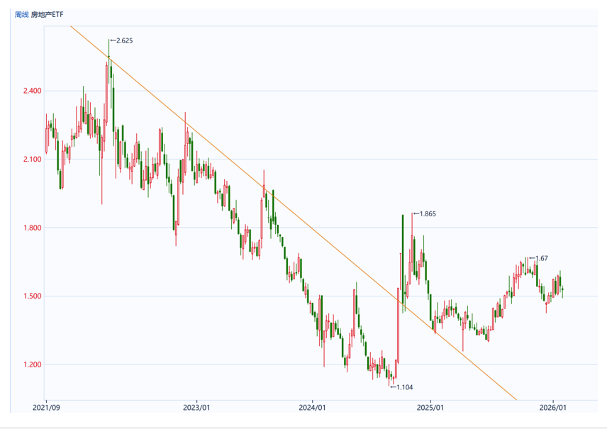 因此对应到最近的市场表现来看,房地产板块近期呈现出一定的韧性。尽管未能成为领涨主力,但其周线级别已悄然脱离延续四年的下跌趋势线,整体走势相对稳健。特别是在1月宽基ETF出现显著资金净流出的背景下,以房地产为代表的ETF反而获得资金注入,且今日盘中再一次展现出相当的抗跌性,跌幅小于大盘......随着市场逻辑的转变,资金观察地产的视角可能也将发生改变。