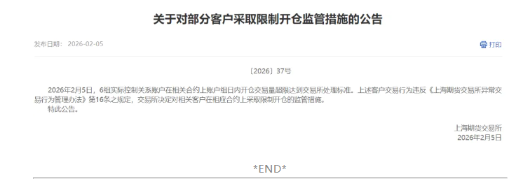 另外,上期所今日发布公告,对部分客户采取限制开仓监管措施。公告称,2026年2月5日,6组实际控制关系账户在相关合约上账户组日内开仓交易量超限达到交易所处理标准。上述客户交易行为违反《上海期货交易所异常交易行为管理办法》第16条之规定,交易所决定对相关客户在相应合约上采取限制开仓的监管措施。