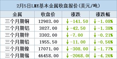 伦敦时间2月5日17:00(北京时间2月6日01:00),三个月期铜收盘下跌141.50美元,或1.08%,报每吨12,903.00美元。