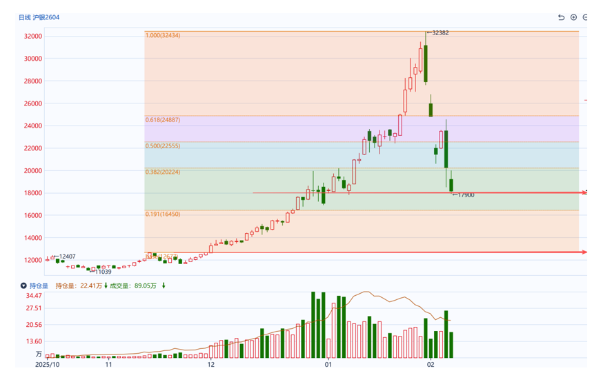 沪银主力Ag2604合约已跌穿重要的技术支撑区域,即20000-20200整数关口附近的黄金分割0.382回调位。盘面在破位后的一次反弹中,于该区域再度承压,初步确认了原有支撑已转化为关键阻力的可能。若价格在短期内无法有效回升至该区域上方,则需警惕市场情绪继续转弱、价格向下再寻支撑的风险。下方关键结构支撑可参考此轮涨势的起点,即12月1日开盘价12650附近,短期也可关注18000整数关口附近的得失。