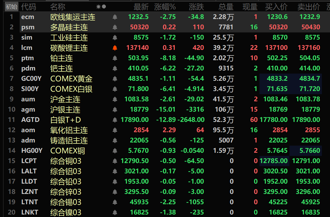此外,铸造铝主连期货跌0.56%,氧化铝主连涨2.29%。碳酸锂主连涨0.31%。工业硅主连跌1.72%。多晶硅主连涨0.22%。
