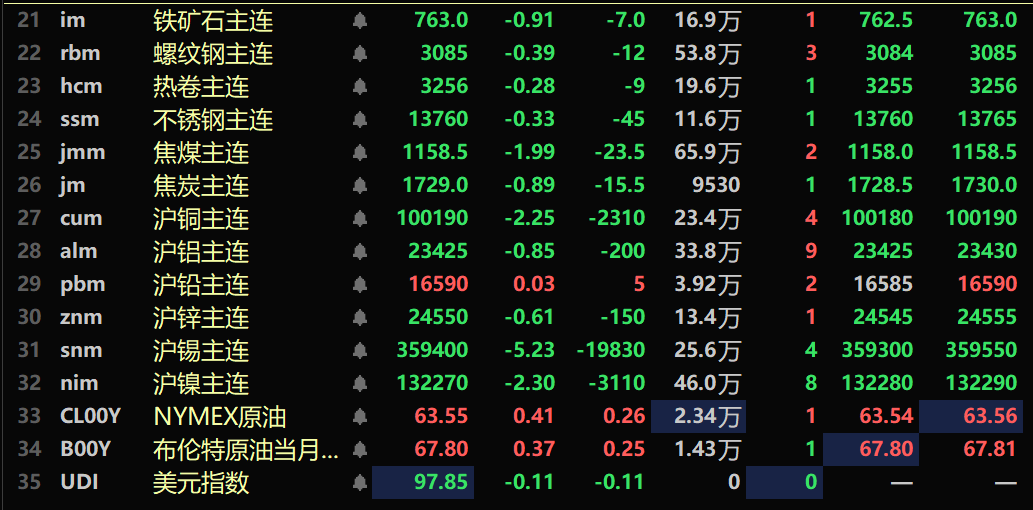 黑色系均飘绿,铁矿跌0.91%,螺纹跌0.38%,热卷跌0.28%,不锈钢跌0.33%。双焦方面:焦煤主力合约跌1.99%,焦炭主力合约跌0.89%。