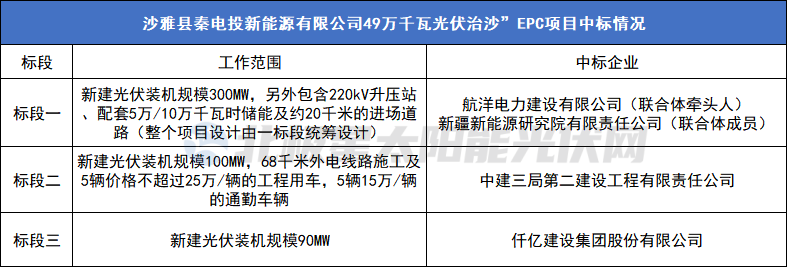 而随着标段一的中标企业敲定,沙雅县490MW光伏治沙EPC项目的中标企业也全部落定,如下: