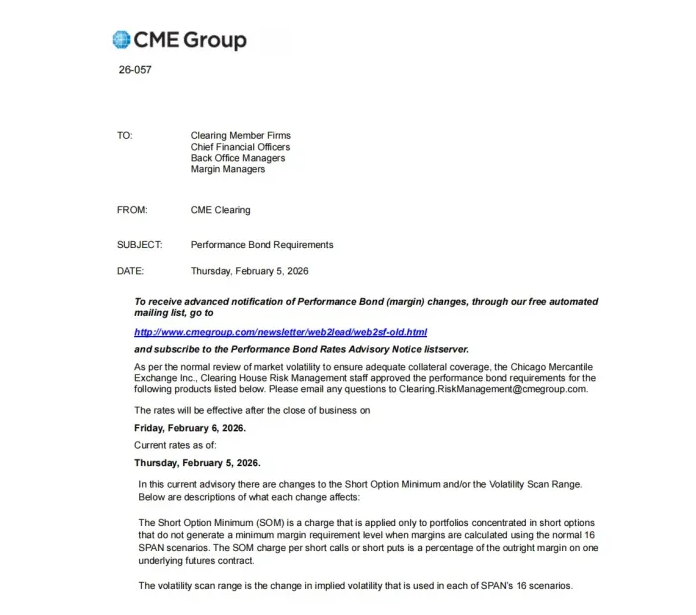 2月5日,芝商所发布保证金调整公告,明确新规则于2月6日收盘后正式生效。本次调整涵盖农业、加密货币、货运、金属等多个领域,除涉及单一品种保证金外,部分品种的跨月价差及跨商品价差保证金也在调整之列。