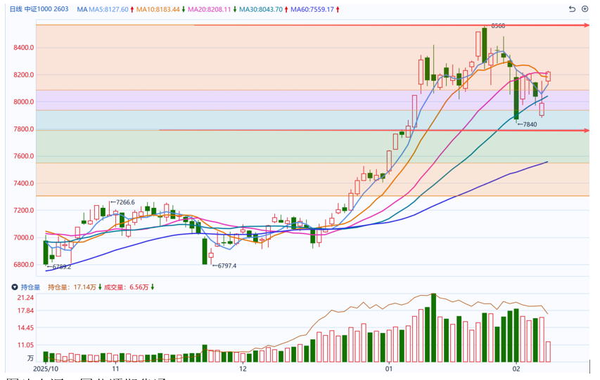 今日,中证1000股指期货主力合约呈现技术性反弹格局。盘面显示,主力IM2603合约完成了一轮标准的技术性回踩,并于关键支撑位附近企稳,再次向上反弹。然而,从整体结构观察,价格尚未有效脱离震荡区间,主流均线仍呈现纠缠状态,表明短期趋势性方向尚不明确。从盘面上看,下方重要支撑可参考7800整数关口附近,而上方压力则关注前期高点8568附近区域。