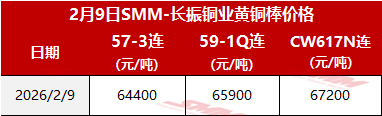 【SMM价格】2026年2月9日长振黄铜棒价格